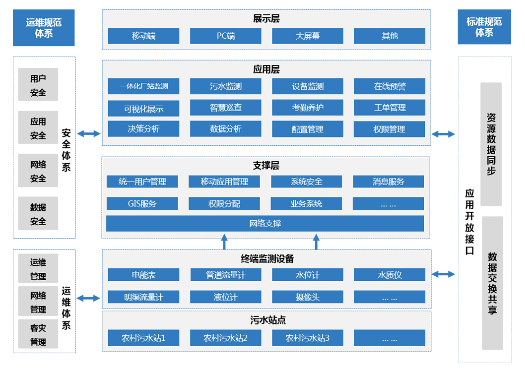針對小城鎮、鄉村污水處理行業共性需求,科大國禎推出了鄉村污水廠遠程監測方案。方案以資源整合、集中監管、規范運營為思路,以平臺化管理為手段,通過先進信息化技術運用,從行業自身運營發展需要出發,提供可視化監測、數據分析、設備管理、巡檢養護、決策支撐等業務功能,從而幫助鄉村污水處理企業提升鄉村污水處理廠管理水平、增強運營管控、優化成本結構,實現精細化運營管理的目的。同時作為相關職能管理部門的有效監管工具,平臺可滿足農村污水治理項目的跟蹤管控、長效運營、效益評審、考核結算等監管需求,實現對治污企業的全面考核,顯著提升鄉鎮人居環境和生態質量。