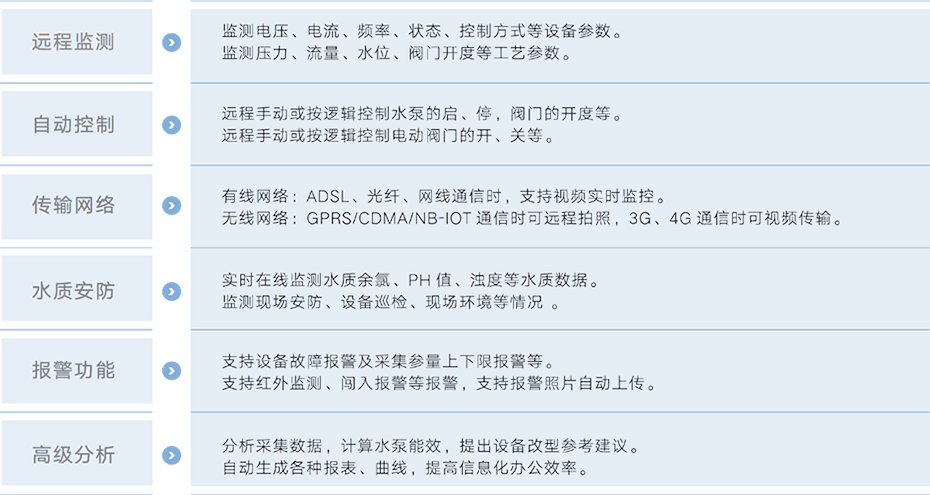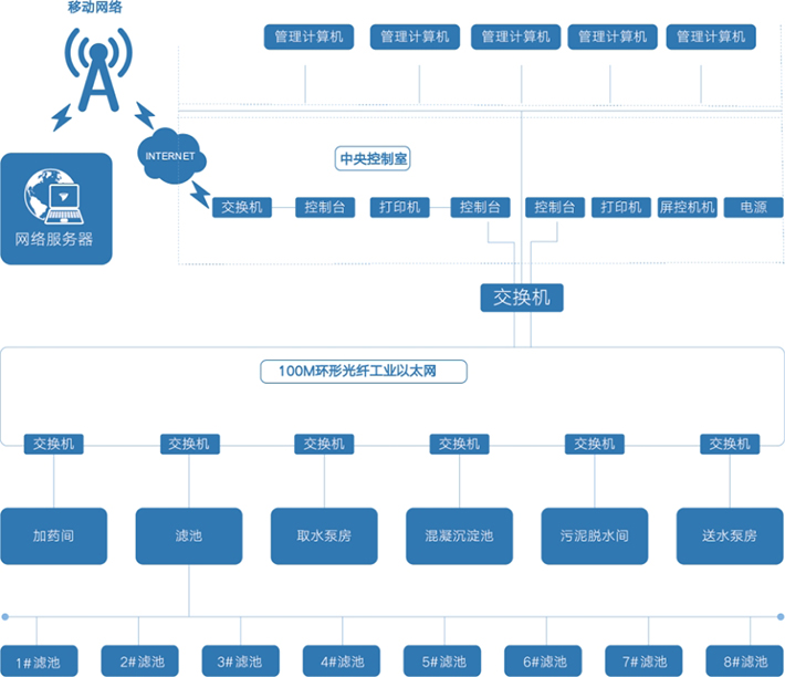 自來水廠控制系統(tǒng)適用于供水企業(yè)遠(yuǎn)程監(jiān)控管理水廠。水廠操作人員可以在水廠控制室遠(yuǎn)程監(jiān)測廠內(nèi)水池水位、進(jìn)廠流量、出廠流量、出廠壓力、水質(zhì)等信息;通過可視化監(jiān)測界面可遠(yuǎn)程監(jiān)測加壓泵組、配電設(shè)備及其它自動化設(shè)備的工作情況;必要情況下,可遠(yuǎn)程控制加壓泵的啟停。水司調(diào)度中心工作人員及公司主管領(lǐng)導(dǎo)可以遠(yuǎn)程監(jiān)測各水廠的工作情況及水廠操作人員的操作情況。